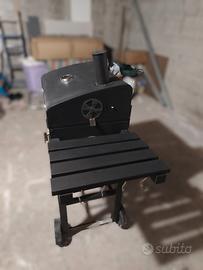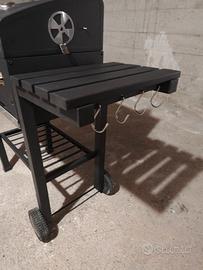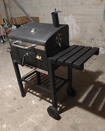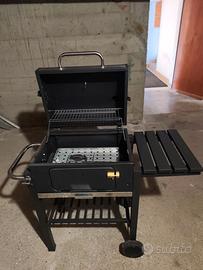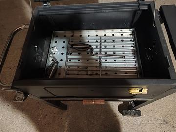 Barbecue a carbonella portatile, con rotelle per essere spostato facilmente, usato solo una volta, vendo per impossibilità a usarlo. Coperchio con termometro, mensola richiudibile con ganci, doppia griglia interna; cassetto per raccogliere cenere. Misure: largezza totale 82 cm; larghezza solo copertura barbecue superiore 54 cm; largezza con mensola aperta 112 cm circa (misura mensola 30 cm); altezza totale con tubo superiore/camino 112 cm, altezza senza tubo 100 cm; profondità 41 cm, 61 con manico frontale (+10 cm)