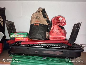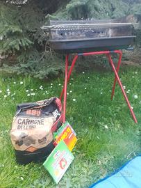 Barbeque portatile con griglia in acciaio inox, per 4 porzioni, con protezione fiamma e calore in acciaio, incluso 1 sacco di carbonella e tanica lt 5 di petrolio bianco da lampada campeggio e/o innesco e/o pulizia attrezzi. Consegna diretta zona Milano e hinterland