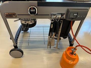 Vendo Barbeque Weber Performer Deluxe 57 usato poco e sempre conservato al coperto . Completo di girarrosto , supporto per il coperchio , igrill2 Bluetooth , bombola da 3 kg e copertura originale.