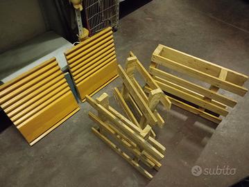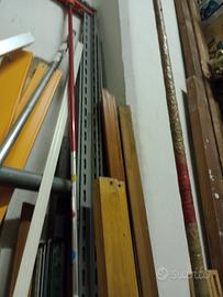 Quadrelli legno n. 3 MT. 3,75 + tavolati legno e cantinelle varia misura, scaffali metallo con cavalle, alcuni bancali - blocco/singolo.