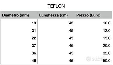 Barre in teflon, prezzo come da foto. possibilità di tagli di lunghezze differenti. Il diametro soffre di un errore di circa mezzo millimetro, nella tabella è riportato il diametro nominale.