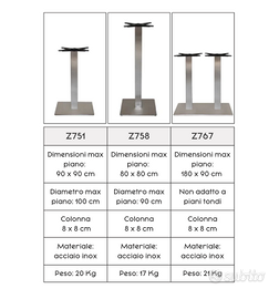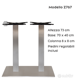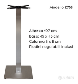 Vendo basi per tavoli in acciaio inox satinato, solide e dal design moderno, ideali per casa, bar, ristoranti e locali. - Acciaio inox resistente alla corrosione - Piedini regolabili inclusi - Struttura stabile per uso quotidiano - Perfette per arredamento indoor e contract Modelli disponibili: - Z751 – 45x45 H73 cm (piani max 90x90 o Ø100) euro 129,00 - Z758 – 45x45 H107 cm (piani max 80x80 o Ø90) euro 139,00 - Z767 – 70x40 H73 cm (piani max 160x90 – no tondi – 2 colonne) euro 182,00 base tavolo acciaio inox, basi per tavoli inox satinato, base tavolo bar, base tavolo ristorante, piantana tavolo acciaio, base tavolo quadrata, base tavolo alta bar, forniture horeca, arredamento ristorante, arredamento bar, base tavolo contract, struttura tavolo inox, base tavolo Made in Italy, base tavolo moderna, base tavolo resistente