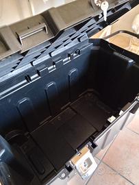 Vendo baule porta utensili Stanley originale (Ref. 82353192), grande capacità circa 190 litri. Dimensioni importanti (circa 96 x 58 x 59 cm), ideale per attrezzi anche ingombranti come trapani, elettroutensili, cavi e attrezzatura varia. Struttura in polipropilene resistente, adatta a uso intensivo (garage, officina, cantiere), con ruote robuste e manico telescopico per trasporto comodo. Capacità extra large (190L) Ruote in ottimo stato Manico telescopico tipo trolley Serratura centrale funzionante con 2 chiavi incluse. Predisposizione per lucchetti aggiuntivi. Coperchio con scanalature porta-taglio e scala graduata (utile per misurare e tagliare) Note: Assente il vassoio interno estraibile. Perni cerniere posteriori del coperchio sostituiti. unico difetto vedi ultima foto (non interferisce con utilizzo) Segni di utilizzo presenti nella parte inferiore lato sinistro Condizioni: come da foto Prezzo: 65 €uro Ritiro: solo a mano (no spedizione per dimensioni e peso)
