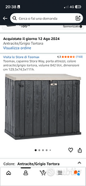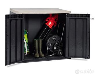 Vendo baule da esterno Toomax Stora Way usato, ideale per riporre attrezzi da giardino, cuscini o materiali vari. Realizzato in resina resistente agli agenti atmosferici, con apertura dall’alto e sportelli frontali.