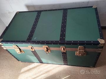 baule vintage di grandi dimensioni, caratterizzato da una struttura rigida rivestita in materiale verde con rifiniture nere e borchie metalliche. Il baule è dotato di chiusure e angoli rinforzati in metallo dorato, che ne conferiscono un aspetto robusto e classico dim. 57x110 h60cm