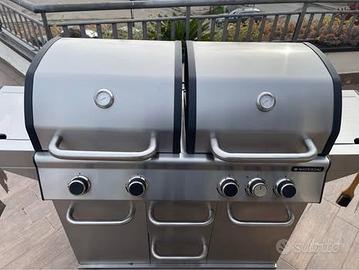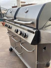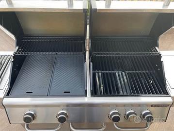 Barbecue a gas con 4 fuochi e 1 fornello laterale (14 kW + 3 kW). Struttura in acciaio smaltato, griglie e piastra in ghisa smaltata. Dotato di termometro, porta salviette, apribottiglie, spazio per la bombola del gas, due cassetti e ganci per gli utensili da cucina. Multicottura: grill, piastra, coperchio per la cottura al forno e un fornello laterale - Facile da spostare grazie a 4 ruote girevoli.