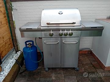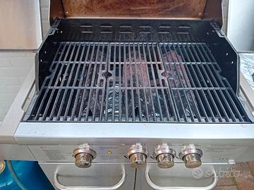 vendo bbq a gas tenuto maniacalmente,lavato e pulito dopo ogni utilizzo,3 fuochi più fornello esterno,completo di 3 griglie in ghisa,una piastra in ghisa,1 piastra in acciaio artigianale ottima per hamburger,1 teglia in acciaio.