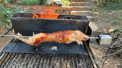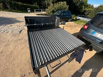 Vendo causa inutilizzo BBQ completamente in ferro con griglia inox a V, fori colagrasso, staffa , supporto e motore elettrico girarrosti, lamiera parafuoco con maniglie e tavolini estraibili, nylon di copertura, ruote anteriori. Usato al massimo 10/12 volte.