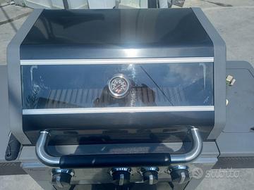 Vendo BbQ con 3 bruciatori in acciaio inox, più fuoco laterale. Accensione piezo area di cottura 63x44cm in ghisa con canalina di scolo e raccoglitore del grasso laterale. Il coperchio con doppio isolamento e con il vetro lungo tutta la superficie di cottura. Il vetro è utile perche si può vedere all’interno senza aprire il coperchio mantenendo la temperatura costante riducendo lo spreco di gas. È dotato di termometro come si vede dalle foto. All’esterno si trova un pratico porta rotolo e ganci per spatole. Sono disponibile per maggiori informazioni e/o per visionarlo a Tarantasca. Ritiro a carico dell’acquirente.