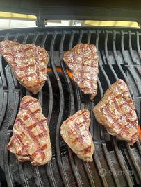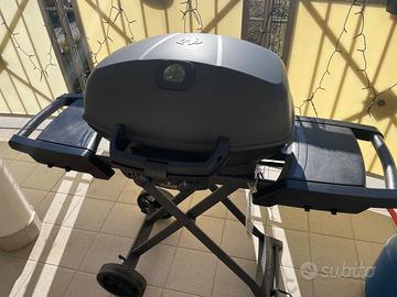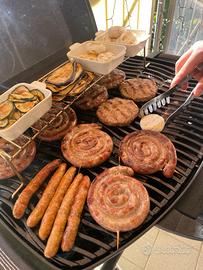 Il barbecue è usato, ma in ottime condizioni e perfettamente funzionante. Ha due bruciatori separati, griglie in ghisa smaltata che tengono benissimo il calore e permettono di avere quelle belle marcature da steakhouse. Il carrello pieghevole è stabile ma facile da richiudere e trasportare, ideale anche per campeggio o gite fuori porta.