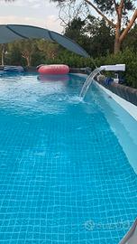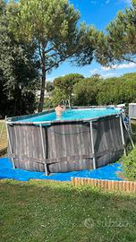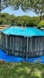 Forma Ovale, Colore piscina Effetto legno scuro, Nr. persone Max 11-15, Lunghezza piscina 732 cm, Larghezza piscina 366 cm, Altezza piscina 122 cm, Altezza max acqua 110 cm, Capacità piscina 25495 L, Portata oraria max pompa 9463 L/h, Filtro A cartuccia.