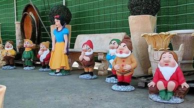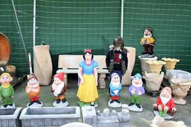 Serie completa di Biancaneve e sette nani in cemento e marmo decorati a mano, adatti per esterno, non temono l'acqua.