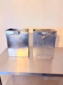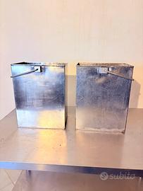 Vendo coppia di bidoncini in acciaio inox con apposite maniglie. Si presentano in buone condizioni con segni del tempo e dell'utilizzo che conferiscono loro un carattere vissuto e autentico. Uno dei due contenitori riporta dei fori appositi in prossimità della base, mentre l'altro è integro no. I contenitori sono estremamente versatili: possono essere utilizzati in ristoranti, officina, in giardino ecc... La vendita si intende per la coppia vista e piaciuta. dimensioni: 30.5 x 20.5 x 40 cm altezza . Disponibile la spedizione o ritiro di persona.