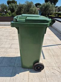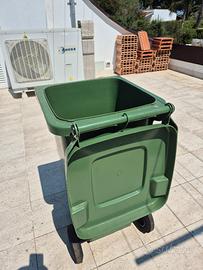 Bidone di colore verde da 120 l. con ruote in gomma piena silenziose. Lunghezza: 55 cm. Larghezza: 48 cm. Altezza: 93 cm. Profondità: 86 cm. Peso: 9,15 kg. Materiale: polietilene (HDPE). In ottime condizioni, vendo per inutilizzo.