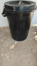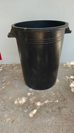 Bidone in plastica nera con coperchio e manici in buono stato, utilizzato solo per contenere dei vasi per piantine.