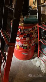 Bidoni industriali dipinti di rosso con adesivi ottimi per spazi esterni come punto d’appoggio e tavolini. 50€/l’uno