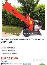 vendo biotrituratore agrinova zoe 50 in perfette condizioni, ottimo per chi vuole triturare potatura che non ha possibilità di bruciare e renderlo un ottimo fertilizzante per il terreno, per info telefono o whastapp 3385483935, prezzo non trattabile, se veramente interessati qualsiasi prova, smontando l'imbuto entra anche in auto.