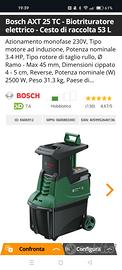 Azionamento monofase 230V, Tipo motore ad induzione, Potenza nominale 3.4 HP, Tipo rotore di taglio rullo, Ø Ramo - Max 45 mm, Dimensioni cippato 4 - 5 cm, Reverse, Potenza nominale (W) 2500 W, Peso 31.3 kg