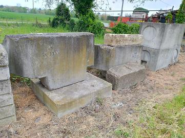 Cedo i blocchi di cemento e zavorre per gru che vedete in foto a chi venisse a ritirarli a Forlì, a 5 minuti dal casello. In generale sono in condizioni abbastanza buone, a parte alcuni incompleti e molto degradati dalle intemperie.