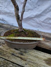 prunus fiore bianco rinvasato nel 2025 in vaso bonsai marchiato, in fioritura.