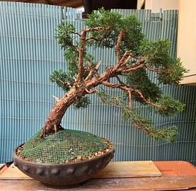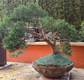 ginepro kishu stile eretto formale . h con vaso 52 cm , h pianta 39 cm , nebari 9 cm . vaso tondo dimensioni 32x32 cm , h 10 cm .