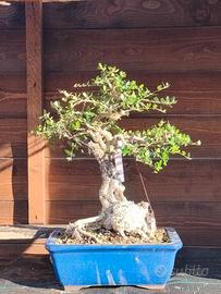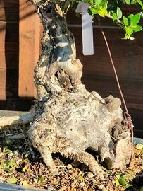 Provenienza: Italia-->Sicilia Dimensioni: - Altezza vaso escluso: 44cm -Nebari: 21cm - Punto forte: [nebari/conicità/corteccia e secco/ramificazione] -vaso gres smaltato blu:32x25x11cm
