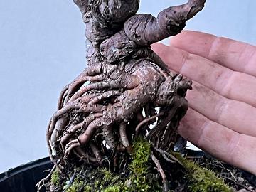 bonsai olmo minore con nebari molto particolare . Altezza sola pianta 30 cm , piede 7 cm