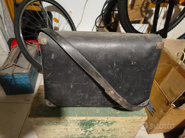 borsa da sella in pelle nera, probabilmente un accessorio vintage per una motocicletta o una bicicletta.