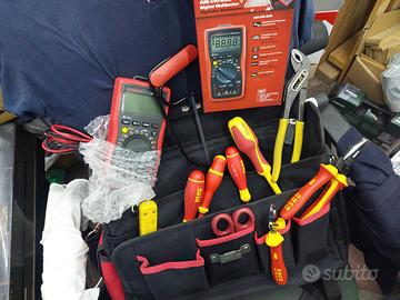 Borsa portatile originale inclusa di attrezzi Usag (cacciaviti e pinze) ed altri accessori (tester, seghetto) mai usati .