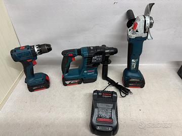 Vendo kit della bosch composto da trapano avvitatore gsb 18v - 45, tassellatore compatto gbh 18v - 22 e smerigliatrice gws 18v - 10, completo di 3 batterie da 18v 5 ah e caricatore rapido gal 1880. Tutto perfettamente funzionante ed in ottime condizioni.