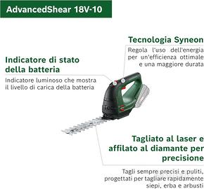 In dotazione: AdvancedShear 18V-10, 1 lama rifilasiepi, 1 lama per forbici per erba, confezione in cartone
