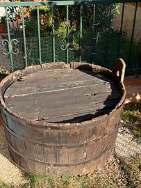Botte in legno scuro usata con tavolo da agganciare sopra e tinozza in buone condizioni con parte interna rivestita contro acqua umidità ecc.. in buone condizioni . RITIRO A MANO