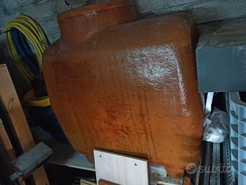 Vendesi per inutilizzo botte orizzontale in vetroresina per alimenti di 400 l. con aperture superiore e frontale grandi in acciaio inox.