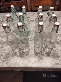 12 bottiglie in vetro trasparente da litri 1, con pratico tappo ermetico di chiusura e ghiera in filo zincato e gomma idonea al contatto con gli alimenti e 2 portabottiglie da 6 posti in plastica. Prezzo per 12 bottiglie e 2 portabottiglie euro 25. Prezzo per 6 bottiglie e 1 portabottiglie euro 15. Preferito ritiro diretto.