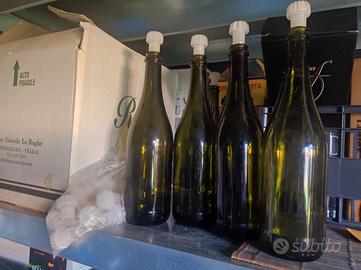 una quarantina di bottiglie per il vino da 750 ml come quelle in foto (forse anche 50), colore verde scuro, tutte riempite solo una volta, lavate e conservate con il tappo solo appoggiato per non fare penetrare la polvere.