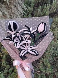 bouquet eterno realizzato interamente a mano con scovolini pelosi, confezionato con carta crespa e tulle. fiori artificiali