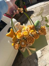 Bouquet Artigianale in Cera di Soia Perché regalare dei fiori che appassiscono quando puoi donare un’opera d’arte che profuma per sempre? ✨ Ti presentiamo la nostra esclusiva Flower Box artigianale, interamente realizzata a mano con 100% cera di soia naturale. Non è solo un bouquet, ma un’esperienza sensoriale che unisce la delicatezza dei fiori alla purezza di una materia prima vegetale e sostenibile. 💛 Cosa rende speciale questa creazione: • Dettagli Incredibili: Rose vellutate, margherite solari e una leggiadra farfalla, tutto modellato in cera con precisione sartoriale. • Il Tocco di Tenerezza: Un dolcissimo coniglietto bianco e un uovo decorato emergono tra i fiori, rendendola l'idea regalo perfetta per una Pasqua alternativa o per festeggiare una nuova nascita. • Design Elegante: Confezionata in una raffinata box verde bosco con manico e fiocco in raso dorato, pronta per essere esposta e ammirata. 🎨 La tua fantasia non ha limiti! Ami questa composizione ma preferiresti altre tonalità? Nessun problema! Possiamo realizzare il tuo bouquet in qualsiasi colore desideri: • Rosa cipria e bianco per un battesimo o una comunione 🎀 • Rosso passione per una laurea o un anniversario ❤️ • Lilla e glicine per un tocco provenzale e rilassante 💜 Ogni pezzo è personalizzabile nella fragranza e nella palette cromatica per adattarsi perfettamente al tuo stile o al tema del tuo evento. Porta a casa l'artigianato che emoziona. > 💌 Contattaci in privato per personalizzare il tuo bouquet o per richiedere un preventivo per le tue bomboniere!