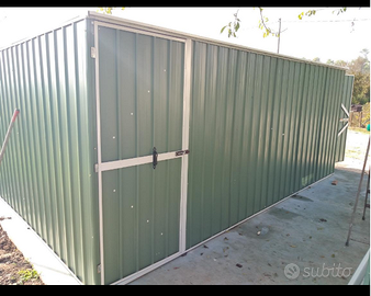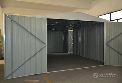 Box in lamiera, casetta, garage auto , prefabbricato componibile di Acciaio Zincato per riporre gli attrezzi da giardino con due ampie porte a battente e porta laterale per doppio ingresso.