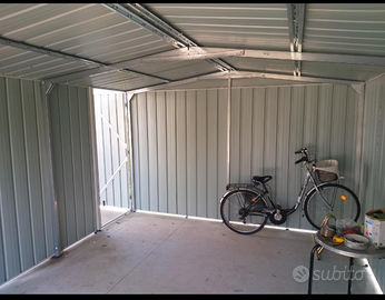 Il box auto in lamiera di Acciaio Zincata grecata con portone a doppia anta e porticina laterale, perfetto per il giardino usato come capanno per ricovero rimessa attrezzi o come riparo per auto, moto , baracca da cantiere.