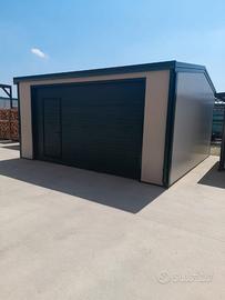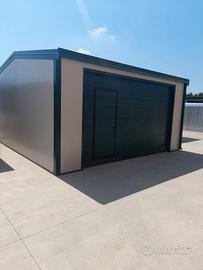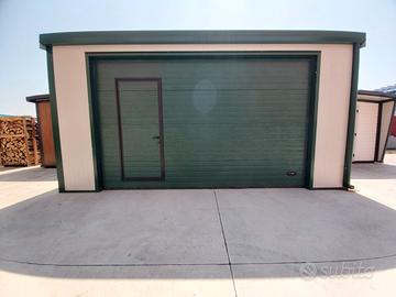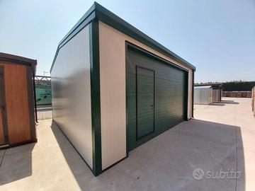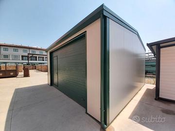 Box auto tetto a casetta Dimensioni: Largh. 5.500 x Lungh. 5.500 x Alt 2.680/3.100 mm. Struttura in ferro verniciata, pareti in pannelli sandwich sp. 40 mm dogato bianco grigio, copertura con pannello sandwich grecato sp. 40 mm colore bianco grigio, completo di lamiere di bordatura e canale raccolta acqua. Completo di porta sezionale coibentata con pannello sandwich verde finitura effetto goffrato, completa di automazione a traino e portina pedonale, dim. 4.000x2.440 H mm. Prezzo escluso di trasporto e montaggio. Esclusa Iva a norma di legge.
