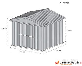 Box casetta 3.27 x 2.69 capanno in lamiera zincata da giardino o cantiere facile da montare grazie al manuale e il kit di montaggio comprensivo di tutta la ferramenta. Casetta per attrezzi, prefabbricato in lamiera di Acciaio Zincata grecata perfetto per il giardino usato come capanno per ricovero rimessa attrezzi da giardinaggio o come riparo per bici e frese. SPEDIZIONE IN TUTTA ITALIA INCLUSA NEL PREZZO * Dimensioni esterne (solo perimetro): 3.07 m (Larghezza) x 2.69 m (Lunghezza) x 2.15 m (Altezza Max) Dimensioni interne: 3.03 m (Larghezza) x 2.65 m (Lunghezza) x 2.10 m (Altezza Max) Altezza della parete: 1.80 m, altezza colmo 2.15 m Metri Quadri: 8.80 mq Dimensioni porta anteriore: 2 ante per un totale di 1.48 m (Larghezza) x 1,75m (Altezza) Peso struttura: 135 KG Ca. Spessore pannelli: 0,32 mm Spessore profili: 0,70 mm Telefono/Whatsapp: A soli 530 euro IVA, spedizione ed assicurazione sulla spedizione inclusi nel prezzo Possibilita' di acquisto con pagamento alla consegna (SOLO CONTANTI no assegni) Attenzione, il metallo utilizzato non e' ferro o alluminio ma acciaio zincato. Il box in acciao in questione non e' coibentato (pannelli sandwich) ma puo' essere modificato facilmente e con una spesa minima. La casetta da esterno e' composta da profili e pannelli in acciaio zingato e verniciato in maniera da poter resistere alle intemperie. A differenza di quelli in legno i box in lamiera zincata non necessitano di nessuna manutenzione Telefono/Whatsapp: