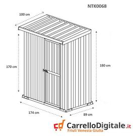Box casetta 1.74 x 1.00 capanno in lamiera zincata da giardino o cantiere facile da montare grazie al manuale e il kit di montaggio comprensivo di tutta la ferramenta. Casetta per attrezzi, prefabbricato in lamiera di Acciaio Zincata grecata perfetto per il giardino usato come capanno per ricovero rimessa attrezzi da giardinaggio o come riparo per bici e frese. SPEDIZIONE IN TUTTA ITALIA INCLUSA NEL PREZZO * Dimensioni esterne (incluso tetto): 1.74 m (Larghezza) x 1.00 m (Lunghezza) x 1.82 m (Altezza) * Dimensioni esterne (solo perimetro): 1.74 m (Larghezza) x 0.89 m (Lunghezza) x 1.80 m (Altezza Max) * Dimensioni interne: 1.70 m (Larghezza) x 0.85 m (Lunghezza) x 1.80 m (Altezza Max) * Altezza della parete: 1.70 m anteriore, 1.80 m posteriore * Metri Quadri: 1.74 mq * Dimensioni porta anteriore: 0.83 m (Larghezza) x 1,65 m (Altezza) * Peso struttura: 45 KG Ca. * Spessore pannelli: 0,32 mm * Spessore profili: 0,70 mm Telefono/Whatsapp: A soli 265 euro IVA, spedizione ed assicurazione sulla spedizione inclusi nel prezzo Possibilita' di acquisto con pagamento alla consegna (SOLO CONTANTI no assegni) Attenzione, il metallo utilizzato non e' ferro o alluminio ma acciaio zincato. Il box in acciao in questione non e' coibentato (pannelli sandwich) ma puo' essere modificato facilmente e con una spesa minima. La casetta da esterno e' composta da profili e pannelli in acciaio zingato e verniciato in maniera da poter resistere alle intemperie. A differenza di quelli in legno i box in lamiera zincata non necessitano di nessuna manutenzione Telefono/Whatsapp: