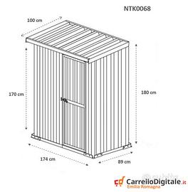 Box casetta 1.74 x 1.00 capanno in lamiera zincata da giardino o cantiere facile da montare grazie al manuale e il kit di montaggio comprensivo di tutta la ferramenta. Casetta per attrezzi, prefabbricato in lamiera di Acciaio Zincata grecata perfetto per il giardino usato come capanno per ricovero rimessa attrezzi da giardinaggio o come riparo per bici e frese. SPEDIZIONE IN TUTTA ITALIA INCLUSA NEL PREZZO * Dimensioni esterne (incluso tetto): 1.74 m (Larghezza) x 1.00 m (Lunghezza) x 1.82 m (Altezza) * Dimensioni esterne (solo perimetro): 1.74 m (Larghezza) x 0.89 m (Lunghezza) x 1.80 m (Altezza Max) * Dimensioni interne: 1.70 m (Larghezza) x 0.85 m (Lunghezza) x 1.80 m (Altezza Max) * Altezza della parete: 1.70 m anteriore, 1.80 m posteriore * Metri Quadri: 1.74 mq * Dimensioni porta anteriore: 0.83 m (Larghezza) x 1,65 m (Altezza) * Peso struttura: 45 KG Ca. * Spessore pannelli: 0,32 mm * Spessore profili: 0,70 mm Telefono/Whatsapp: A soli 246 euro IVA, spedizione ed assicurazione sulla spedizione inclusi nel prezzo Possibilita' di acquisto con pagamento alla consegna (SOLO CONTANTI no assegni) Attenzione, il metallo utilizzato non e' ferro o alluminio ma acciaio zincato. Il box in acciao in questione non e' coibentato (pannelli sandwich) ma puo' essere modificato facilmente e con una spesa minima. La casetta da esterno e' composta da profili e pannelli in acciaio zingato e verniciato in maniera da poter resistere alle intemperie. A differenza di quelli in legno i box in lamiera zincata non necessitano di nessuna manutenzione Telefono/Whatsapp: