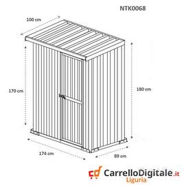 Box casetta 1.74 x 1.00 capanno in lamiera zincata da giardino o cantiere facile da montare grazie al manuale e il kit di montaggio comprensivo di tutta la ferramenta. Casetta per attrezzi, prefabbricato in lamiera di Acciaio Zincata grecata perfetto per il giardino usato come capanno per ricovero rimessa attrezzi da giardinaggio o come riparo per bici e frese. SPEDIZIONE IN TUTTA ITALIA INCLUSA NEL PREZZO * Dimensioni esterne (incluso tetto): 1.74 m (Larghezza) x 1.00 m (Lunghezza) x 1.82 m (Altezza) * Dimensioni esterne (solo perimetro): 1.74 m (Larghezza) x 0.89 m (Lunghezza) x 1.80 m (Altezza Max) * Dimensioni interne: 1.70 m (Larghezza) x 0.85 m (Lunghezza) x 1.80 m (Altezza Max) * Altezza della parete: 1.70 m anteriore, 1.80 m posteriore * Metri Quadri: 1.74 mq * Dimensioni porta anteriore: 0.83 m (Larghezza) x 1,65 m (Altezza) * Peso struttura: 45 KG Ca. * Spessore pannelli: 0,32 mm * Spessore profili: 0,70 mm Telefono/Whatsapp: A soli 265 euro IVA, spedizione ed assicurazione sulla spedizione inclusi nel prezzo Possibilita' di acquisto con pagamento alla consegna (SOLO CONTANTI no assegni) Attenzione, il metallo utilizzato non e' ferro o alluminio ma acciaio zincato. Il box in acciao in questione non e' coibentato (pannelli sandwich) ma puo' essere modificato facilmente e con una spesa minima. La casetta da esterno e' composta da profili e pannelli in acciaio zingato e verniciato in maniera da poter resistere alle intemperie. A differenza di quelli in legno i box in lamiera zincata non necessitano di nessuna manutenzione Telefono/Whatsapp: