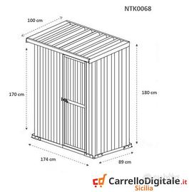 Box casetta 1.74 x 1.00 capanno in lamiera zincata da giardino o cantiere facile da montare grazie al manuale e il kit di montaggio comprensivo di tutta la ferramenta. Casetta per attrezzi, prefabbricato in lamiera di Acciaio Zincata grecata perfetto per il giardino usato come capanno per ricovero rimessa attrezzi da giardinaggio o come riparo per bici e frese. SPEDIZIONE IN TUTTA ITALIA INCLUSA NEL PREZZO * Dimensioni esterne (incluso tetto): 1.74 m (Larghezza) x 1.00 m (Lunghezza) x 1.82 m (Altezza) * Dimensioni esterne (solo perimetro): 1.74 m (Larghezza) x 0.89 m (Lunghezza) x 1.80 m (Altezza Max) * Dimensioni interne: 1.70 m (Larghezza) x 0.85 m (Lunghezza) x 1.80 m (Altezza Max) * Altezza della parete: 1.70 m anteriore, 1.80 m posteriore * Metri Quadri: 1.74 mq * Dimensioni porta anteriore: 0.83 m (Larghezza) x 1,65 m (Altezza) * Peso struttura: 45 KG Ca. * Spessore pannelli: 0,32 mm * Spessore profili: 0,70 mm Telefono/Whatsapp: A soli 246 euro IVA, spedizione ed assicurazione sulla spedizione inclusi nel prezzo Possibilita' di acquisto con pagamento alla consegna (SOLO CONTANTI no assegni) Attenzione, il metallo utilizzato non e' ferro o alluminio ma acciaio zincato. Il box in acciao in questione non e' coibentato (pannelli sandwich) ma puo' essere modificato facilmente e con una spesa minima. La casetta da esterno e' composta da profili e pannelli in acciaio zingato e verniciato in maniera da poter resistere alle intemperie. A differenza di quelli in legno i box in lamiera zincata non necessitano di nessuna manutenzione Telefono/Whatsapp: