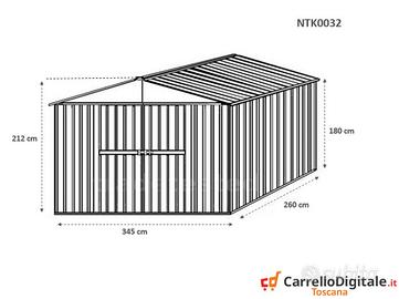 * Dimensioni esterne (incluso tetto): 3.60 m (Larghezza) x 2.60 m (Lunghezza) x
