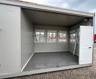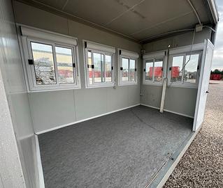 Lo spazio ufficio ha 5 finestre scorrevoli con tapparella ed è aperto completamente su un lato. È possibile inserire a parte la parete mancante. (Possiamo fornirla noi a richiesta con costo da definire)