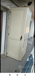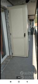 Box/Ripostiglio alluminio ad angolo per balcone o giardino, colore bianco avorio. Lunghezza (lato porta) 77cm; Apertura porta 60cm; Profondità 81 cm; Altezza 220 cm. Come nuovo. Usato pochissimo.