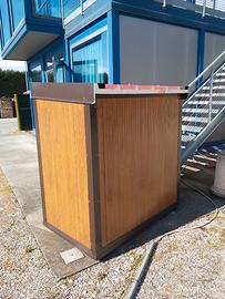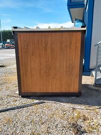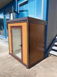 Realizzato con ferro ad U in lamiera preverniciata e rivestito con pannelli sandwich sp. 40 mm dogato finto legno e copertura con pannello sandwich grecato sp. 40 mm colore rosso siena, completo di lamiere di bordatura e portina.