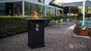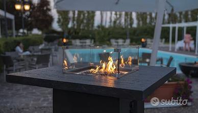 Tavolo da bar quadrato alto con fuoco a gas per uso outdoor, realizzato in cemento alleggerito e rinforzato con fibra di vetro . Bruciatore in acciaio inox con accensione elettronica, regolatore dell’intensità di fiamma e termocoppia di sicurezza.Dimensioni basamento (L x P) 56 x 56 cm, finitura TRAVERTINO. DOTAZIONI INCLUSE: Roccia vulcanica del braciere Copertura di protezione dalle intemperie Ritocco per graffi Riduttore di pressione Tubo di collegamento alla bombola Ceppi simil-legno outdoor, resistenti alle intemperie Protettore antivento quadrato in vetro temperato (4 pezzi), 40 x 40 cm, altezza 19 cm Dotato di apposito alloggiamento per la bombola (versione GPL) NERO. Alimentazione GPL – Pot. Max. 16 kW Piano di appoggio 26 cm (spazio tra bordo e braciere) (Con il coperchio in acciaio il piano è totalmente utilizzabile).